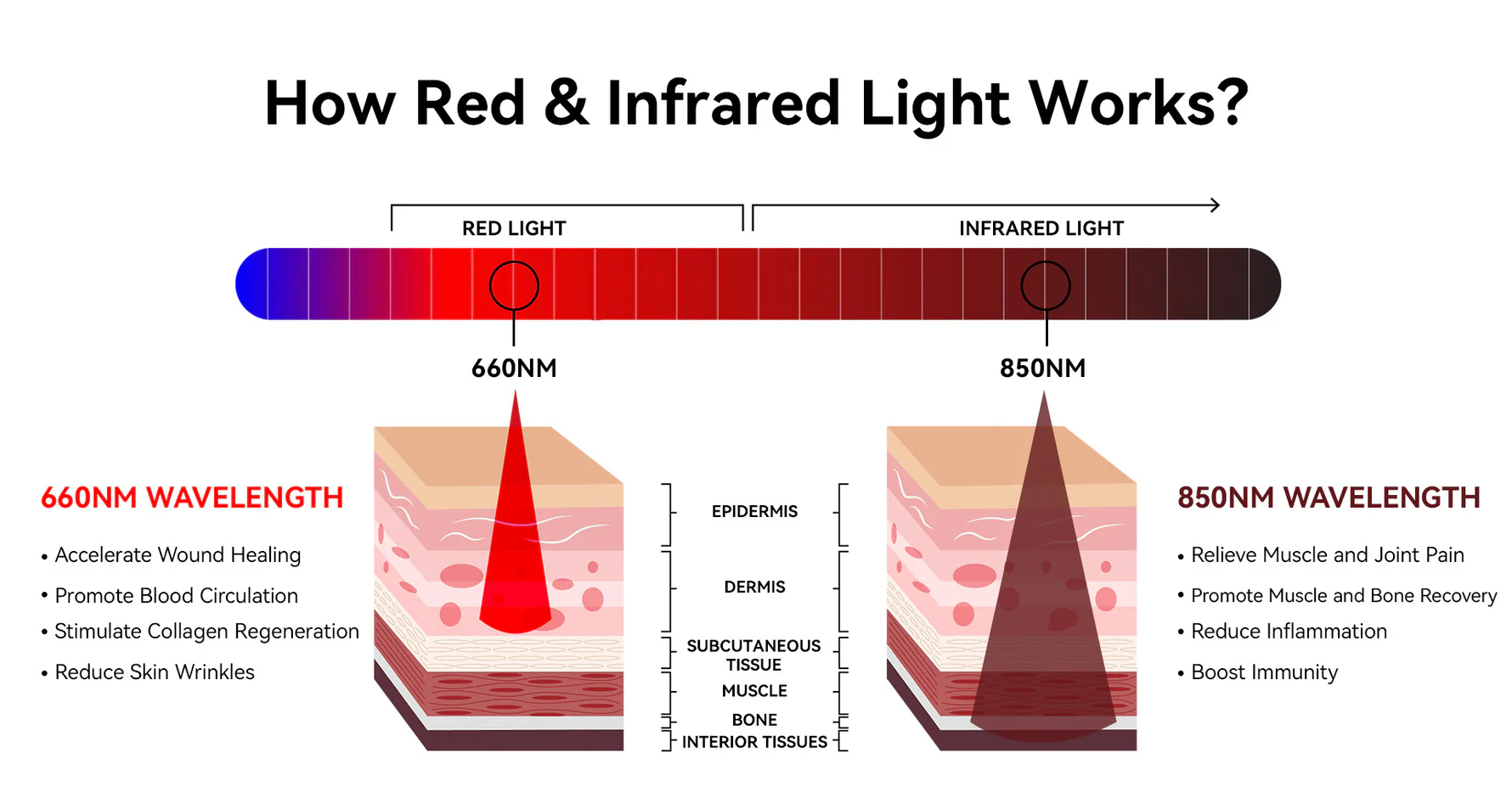 Wavelengths: 660nm (red light), 850nm (near-infrared light)